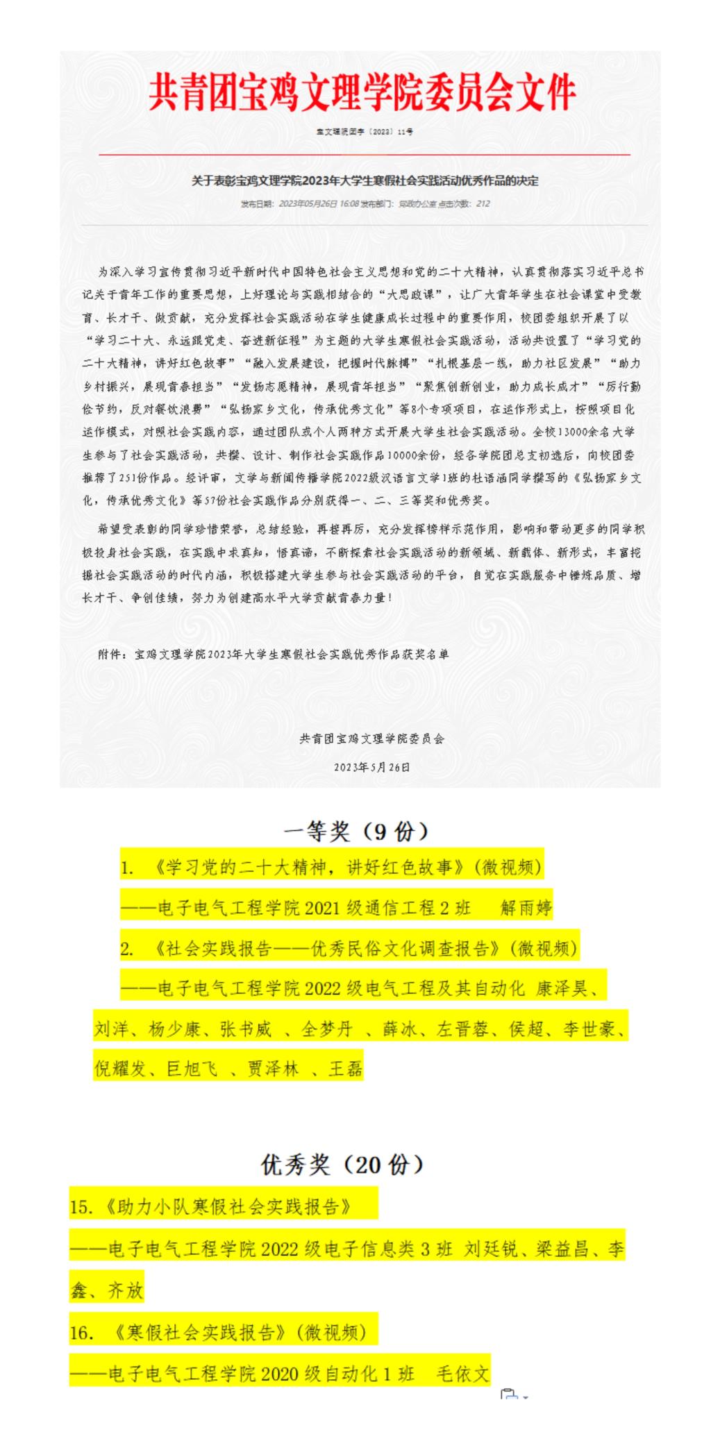 近日,校团委发布了《关于表彰3044永利官网2023年老员工寒假社会实践活动优秀作品的决定》(宝文理院团字〔2023〕11号),公司多个寒假社会实践活动作品获奖。