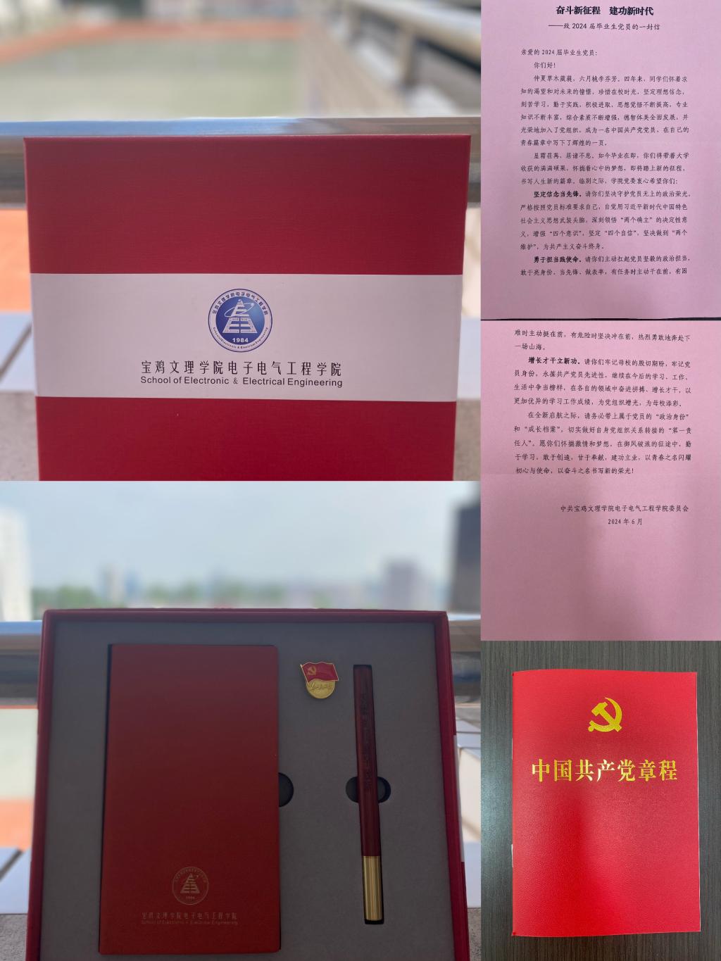 在毕业生党员走出校门之际,公司党委为毕业生党员准备了一份信仰礼包和致2024届毕业生党员的一份信。信仰礼包第一份礼物是最新修订的中国共产党章程,希望全体党员能够始终遵守党的章程,做一名合格的共产党员;第二份礼物是一枚党徽,希望毕业生党员能够时刻牢记党员身份,在工作岗位上继续发挥党员的先锋模范作用,第三份是理论学习笔记本,鼓励毕业生党员持续深化理论武装,永葆党员先进性,不断取得新的成绩和更大进步。全新启航之际,请务必带上属于党员的“政治身份”和“成长档案”,切实做好自身党组织关系转接的“第一责任人”。在致2024届毕业生党员的一份信中,公司党委寄语同学们牢记母校的嘱托,继续在今后的学习、工作、生活中争当榜样,在各自的领域中奋进拼搏、增长才干,以更加优异的学习工作成绩,为党组织增光。