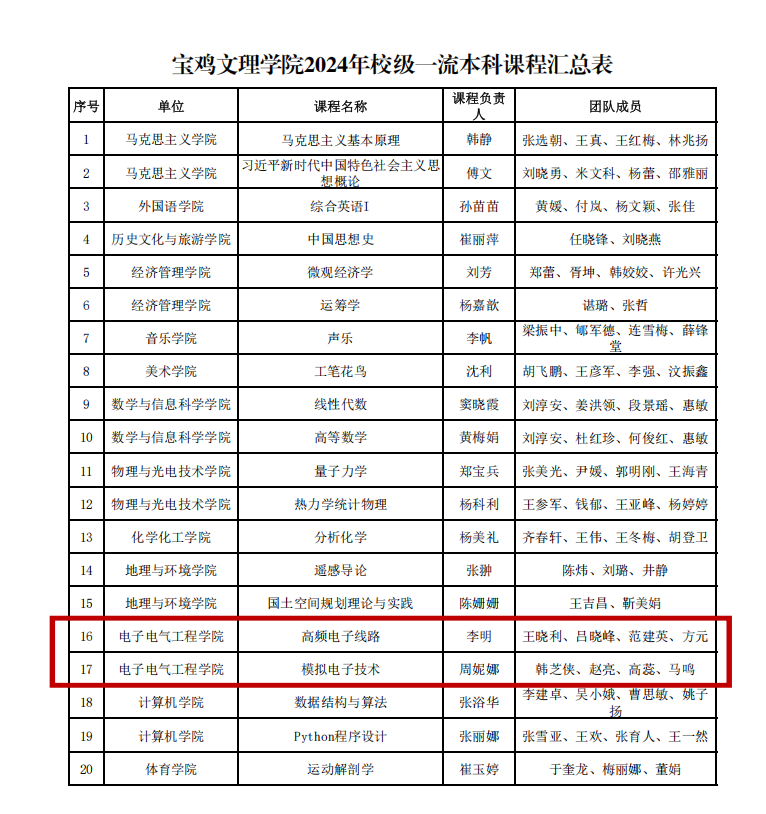 根据《关于开展2024年校级一流本科课程申报工作的通知》要求,经个人申报、公司推荐、专家评议,公司认定公司《高频电子线路 》《模拟电子技术》等2门课程为2024年校级一流本科课程(详见附件)。现将有关事项通知如下: